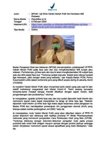 Judul : BPOM : Uji Klinis Vaksin Merah Putih Ikut Sertakan 495