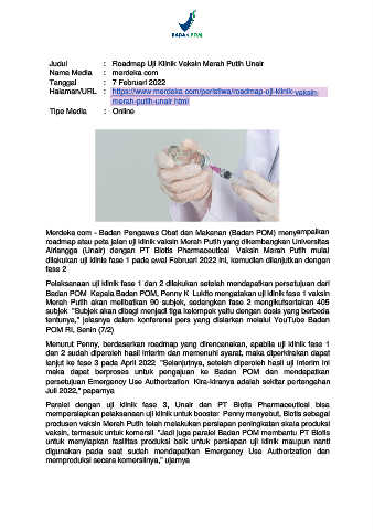 Judul : Roadmap Uji Klinik Vaksin Merah Putih Unair