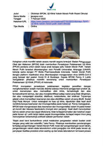 Judul : Diizinkan BPOM, Uji Klinis Vaksin Merah Putih Resmi Dimulai