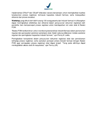 terhadap proses registrasi, serta samakan persepsi antara industri farmasi dengan Badan