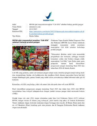 Judul : BPOM ajak masyarakat terapkan “Cek Klik” sebelum belanja produk pangan