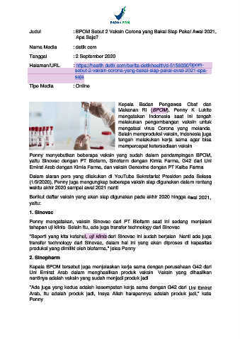 Judul : BPOM Sebut 2 Vaksin Corona yang Bakal Siap Pakai Awal 2021,