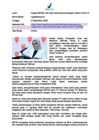 Judul : Kepala BPOM: Dua Opsi Indonesia Kembangan Vaksin Covid-19