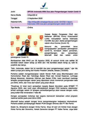Judul : BPOM: Indonesia Miliki Dua Jalur Pengembangan Vaksin Covid-19