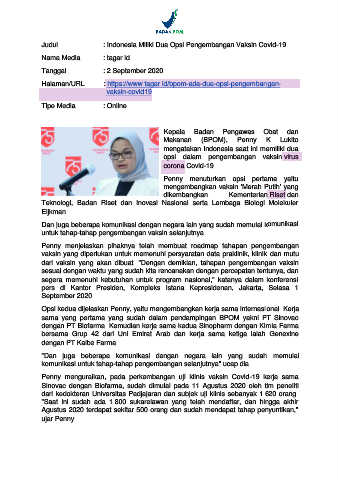 Judul : Indonesia Miliki Dua Opsi Pengembangan Vaksin Covid-19