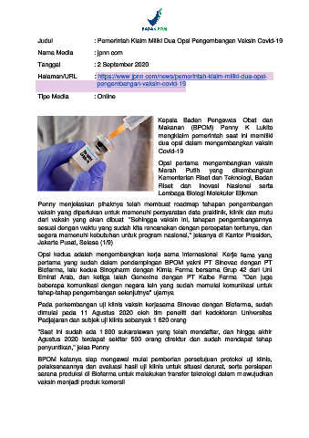 Judul : Pemerintah Klaim Miliki Dua Opsi Pengembangan Vaksin Covid-19