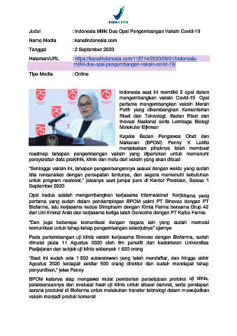 Judul : Indonesia Miliki Dua Opsi Pengembangan Vaksin Covid-19