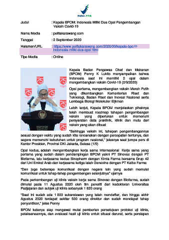 Judul : Kepala BPOM: Indonesia Miliki Dua Opsi Pengembangan