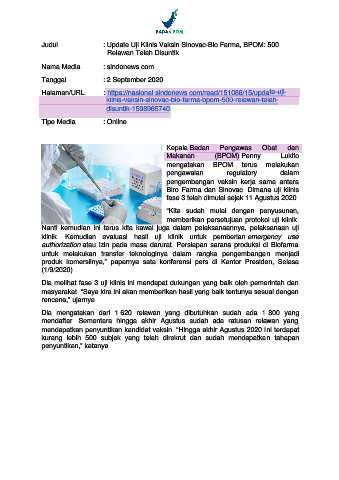Judul : Update Uji Klinis Vaksin Sinovac-Bio Farma, BPOM: 500