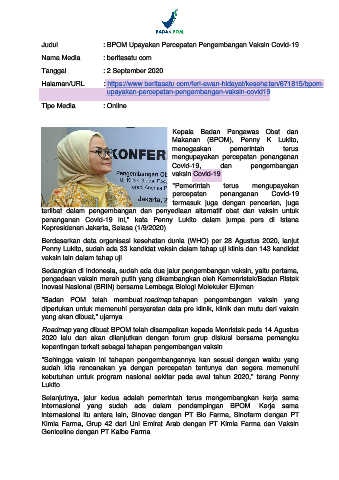 Judul : BPOM Upayakan Percepatan Pengembangan Vaksin Covid-19