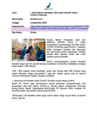 Judul : 1.800 Relawan Mendaftar, 500 Sudah Disuntik Vaksin