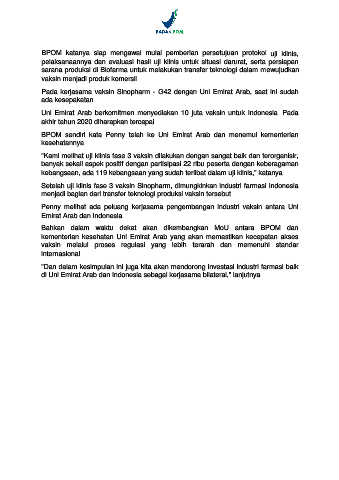 Pada kerjasama vaksin Sinopharm - G42 dengan Uni Emirat Arab, saat ini sudah