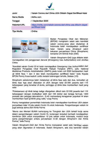 uji klinik fase 1 dan 2 dan telah mendapatkan sertifikasi halal,‖ kata Kepala