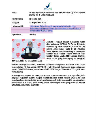 Judul : Kabar Baik untuk Indonesia Usai BPOM Tinjau Uji Klinik Vaksin