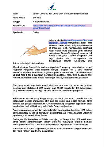 Judul : Vaksin Covid-19 dari China-UEA disebut bersertifikasi halal