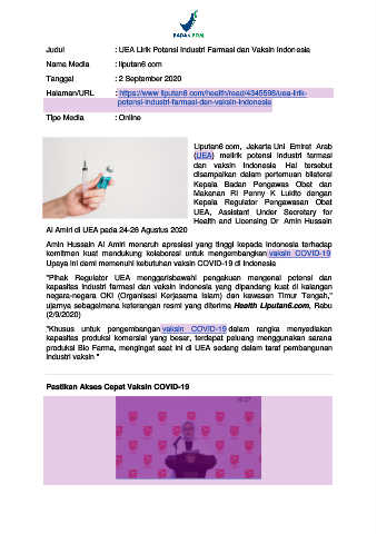 Judul : UEA Lirik Potensi Industri Farmasi dan Vaksin Indonesia
