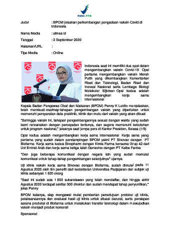 Judul : BPOM jelaskan perkembangan pengadaan vaksin Covid di