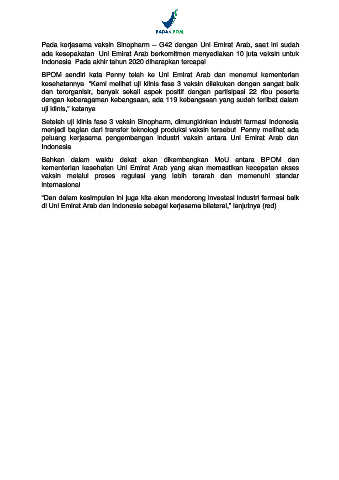 Pada kerjasama vaksin Sinopharm – G42 dengan Uni Emirat Arab, saat ini sudah
