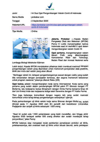 Judul : Ini Dua Opsi Pengembangan Vaksin Covid di Indonesia