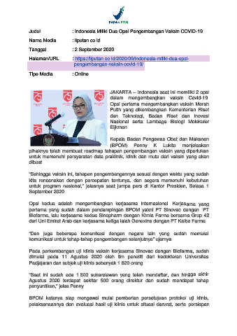 Judul : Indonesia Miliki Dua Opsi Pengembangan Vaksin COVID-19