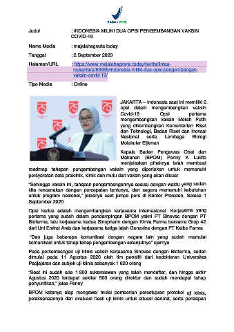 Judul : INDONESIA MILIKI DUA OPSI PENGEMBANGAN VAKSIN