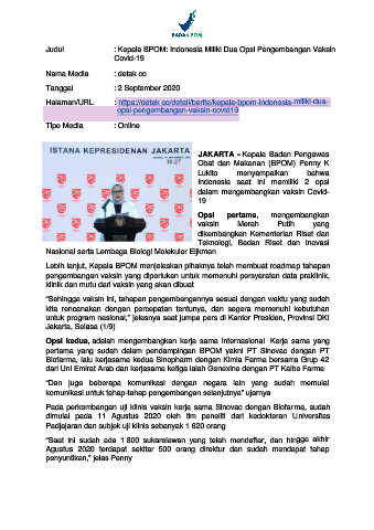 Judul : Kepala BPOM: Indonesia Miliki Dua Opsi Pengembangan Vaksin