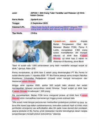 Judul : BPOM: 1.800 Orang Telah Terdaftar Jadi Relawan Uji Klinik
