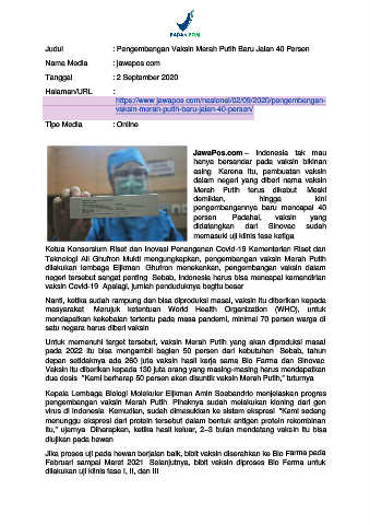 Judul : Pengembangan Vaksin Merah Putih Baru Jalan 40 Persen