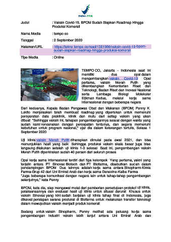Judul : Vaksin Covid-19, BPOM Sudah Siapkan Roadmap Hingga