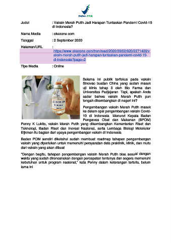 Judul : Vaksin Merah Putih Jadi Harapan Tuntaskan Pandemi Covid-19