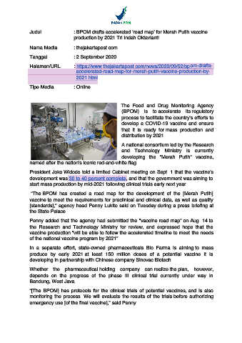 Judul : BPOM drafts accelerated 'road map' for Merah Putih vaccine