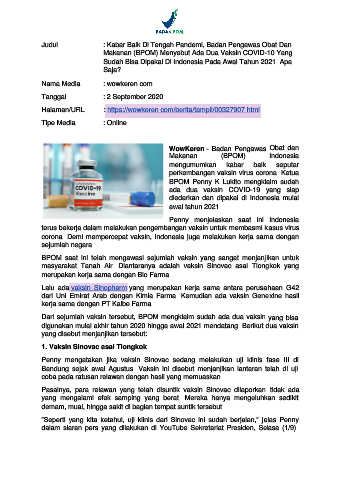Judul : Kabar Baik Di Tengah Pandemi, Badan Pengawas Obat Dan