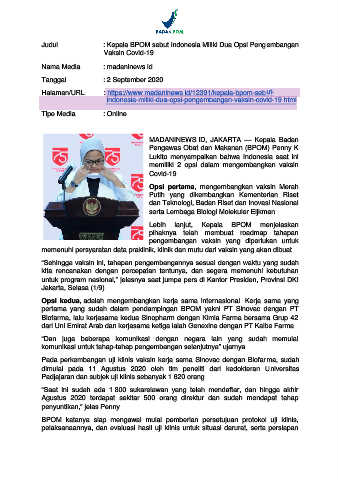 Judul : Kepala BPOM sebut Indonesia Miliki Dua Opsi Pengembangan
