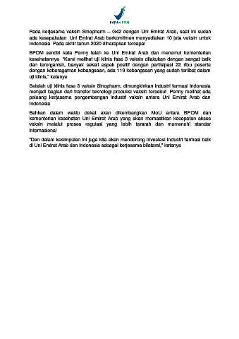 Pada kerjasama vaksin Sinopharm – G42 dengan Uni Emirat Arab, saat ini sudah