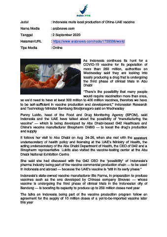 Judul : Indonesia mulls local production of China-UAE vaccine