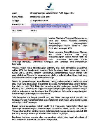 Judul : Pengembangan Vaksin Merah Putih Capai 40%