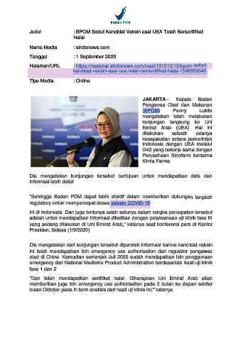 Judul : BPOM Sebut Kandidat Vaksin asal UEA Telah Bersertifikat
