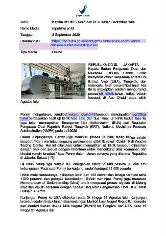 Judul : Kepala BPOM: Vaksin dari UEA Sudah Bersitifikat Halal