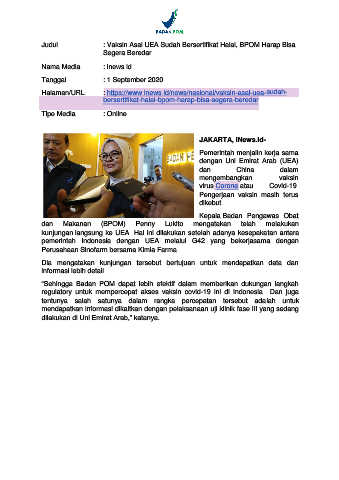 Judul : Vaksin Asal UEA Sudah Bersertifikat Halal, BPOM Harap Bisa