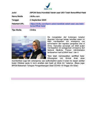 Judul : BPOM Sebut Kandidat Vaksin asal UEA Telah Bersertifikat Halal