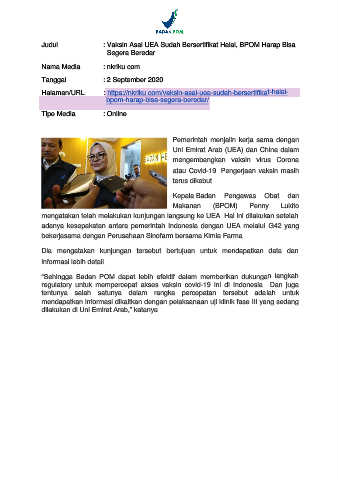 Judul : Vaksin Asal UEA Sudah Bersertifikat Halal, BPOM Harap Bisa