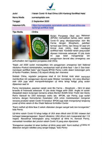 Judul : Vaksin Covid-19 Asal China-UEA Kantongi Sertifikat Halal