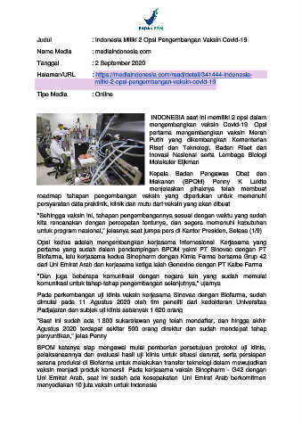 Judul : Indonesia Miliki 2 Opsi Pengembangan Vaksin Covid-19