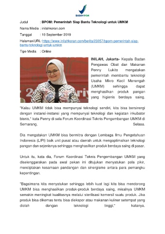 Judul : BPOM: Pemerintah Siap Bantu Teknologi untuk UMKM