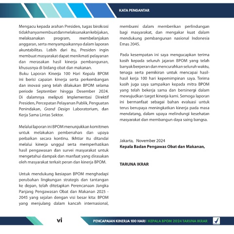 vi PENCAPAIAN KINERJA 100 HARI | KEPALA BPOM 2024 TARUNA IKRAR