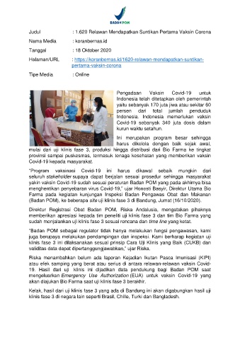 Judul : 1.620 Relawan Mendapatkan Suntikan Pertama Vaksin Corona
