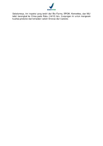 Sebelumnya, tim inspeksi yang terdiri dari Bio Farma, BPOM, Kemenkes, dan MUI