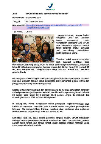 Judul : BPOM: Pada 2019 Banyak Inovasi Perizinan
