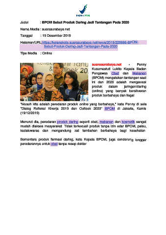 Judul : BPOM Sebut Produk Daring Jadi Tantangan Pada 2020