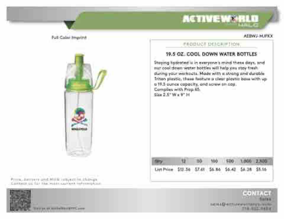 Staying hydrated is in everyone's mind these days, and our cool down water bottles will help you stay fresh during your workouts. Made with a strong and durable Tritan plastic, these feature a clear plastic base with up a 19.5 ounce capacity, and screw on cap.